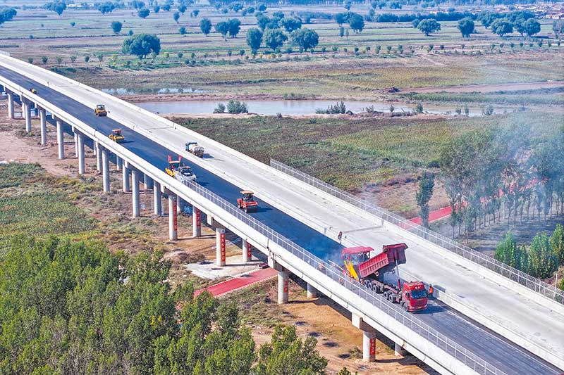 工人在241国道平遥段新建汾河大桥施工现场铺设沥青路面