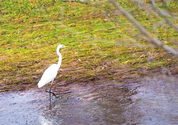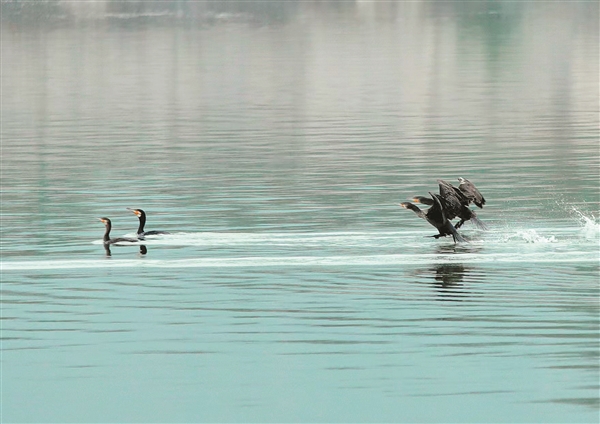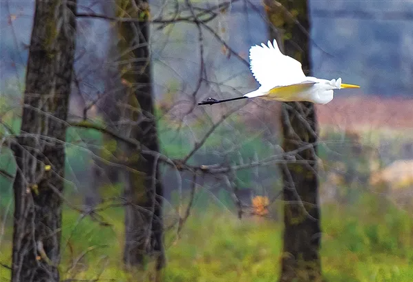 左权县清漳河国家湿地公园白鹭、白琵鹭等珍稀鸟类在河畔悠然觅食、嬉戏飞翔