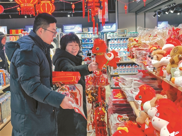 市民在平遥县一家超市内选购布衣马、春联、灯笼等节日饰品