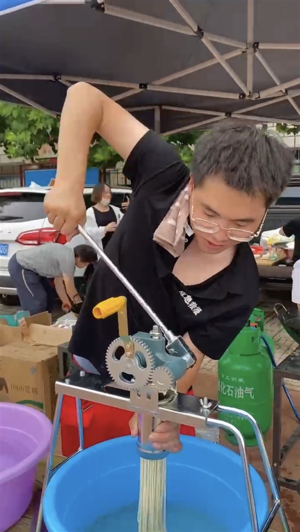 经与当地组织者对接后,8月4日早7点,郜鑫带领队员们开始做饭,洗菜、烧水、和面……5人密切分工,一锅接着一锅,热气腾腾的饸饹面出锅了,来自全国各地的救援队队员也在返回安置点后吃上了热乎饭。