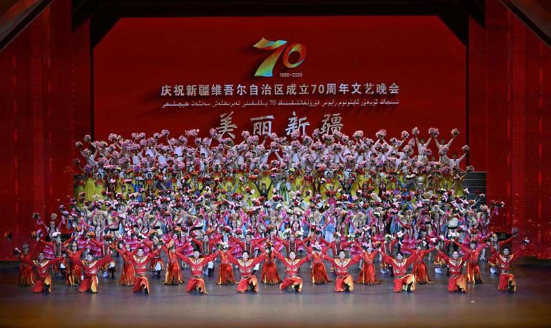 25日上午,习近平总书记在乌鲁木齐市出席新疆维吾尔自治区成立70周年庆祝大会,同新疆各族各界干部群众代表一道,热烈庆祝新疆维吾尔自治区成立70周年。