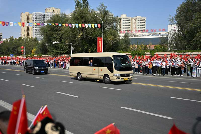 乌鲁木齐市充满节日的喜庆氛围。从机场到住地途中,习近平总书记向沿途群众频频挥手、亲切致意。