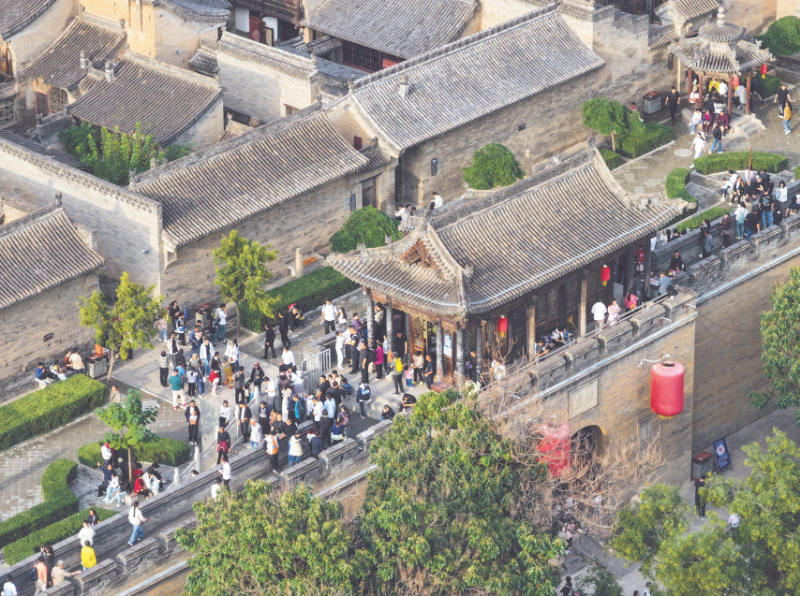 灵石王家大院景区,游客观赏古代民居,感悟晋商文化。
