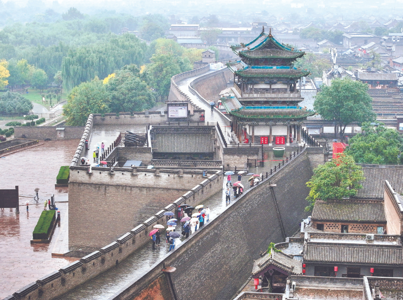 雨中的平遥古城,游人伞下漫步体验别样风情。