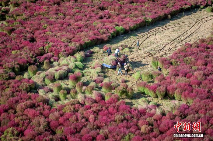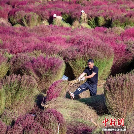 金秋时节,山西省柳林县贾家垣乡曹家沟村180亩扫帚作物进入集中收割期。漫山遍野红艳似火的扫帚草随风摇曳,将黄土高原装点成一片火红海洋。村民们抢抓晴好天气收割扫帚,田间地头呈现出一派热火朝天的丰收景象。