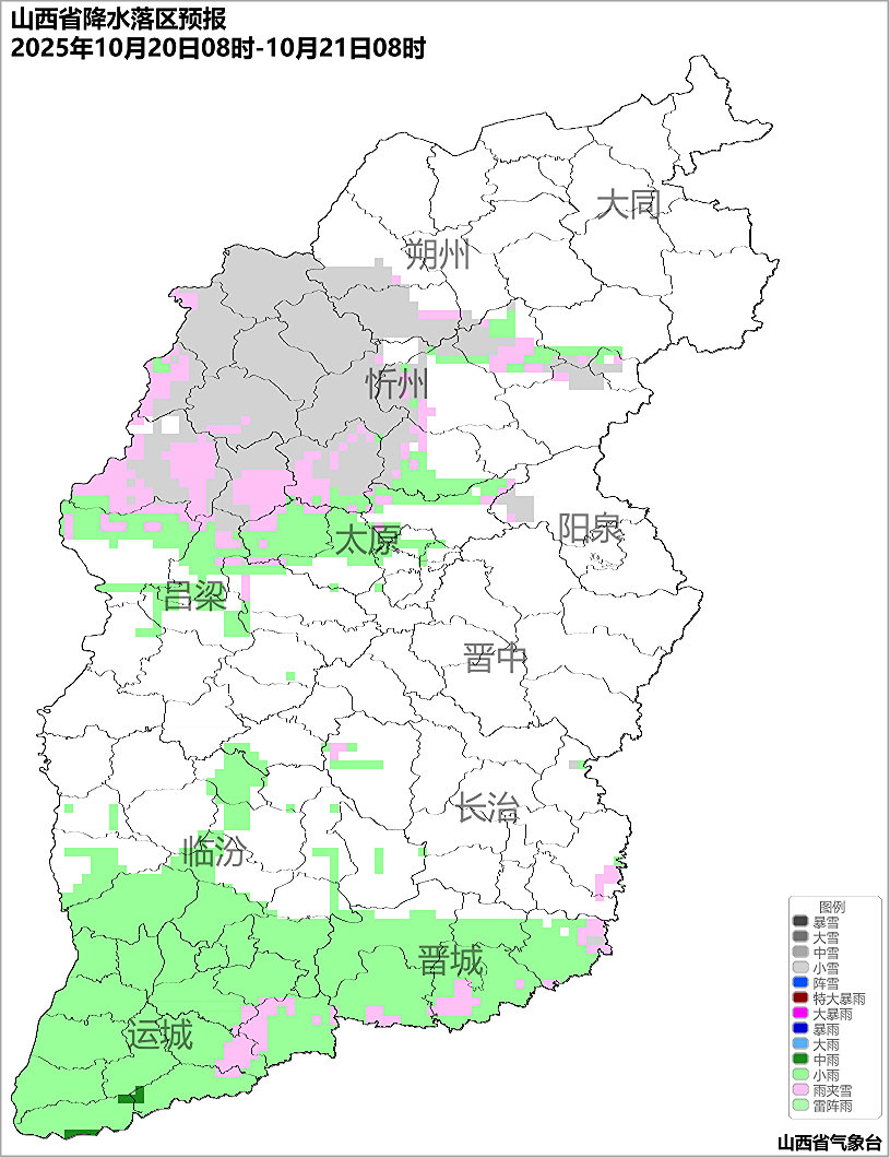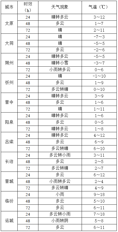 北中部多云转阴天,南部阴天间多云;忻州、吕梁、运城、临汾、晋城等地的部分和朔州、太原等地的局部地区有阵雨或小雨,北部山区有雨夹雪或小雪。