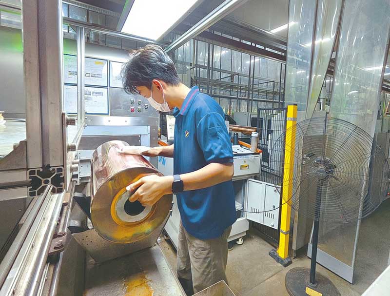 在运城制版集团的生产车间内,工作人员正在检查镀铜后的版辊。本报记者周明飞摄