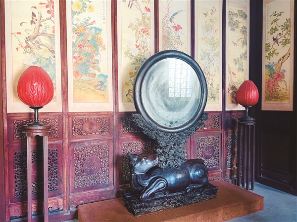 犀牛望月镜 乔家镇宅之宝,国家一级文物,采用东南亚进口铁梨木精雕而成,配以毛光玻璃,造型独特、样式美观、寓意深刻,既有实用价值,又有观赏价值,堪称稀世珍品。整座镜高近2米,重1吨,由三部分构成,上方明镜代表月亮,中间是祥云,底座是犀牛。乔家尊奉“犀牛望月镜”为生财镇宅之宝,也是为了告诫后人无论干什么事情都不能粗心,经商更要一心一意。1997年香港回归时,山西仿制一面“犀牛望月镜”,送给当时的香港特首董建华先生,这面镜子用材和设计非常讲究,寓意香港1997年回归。
