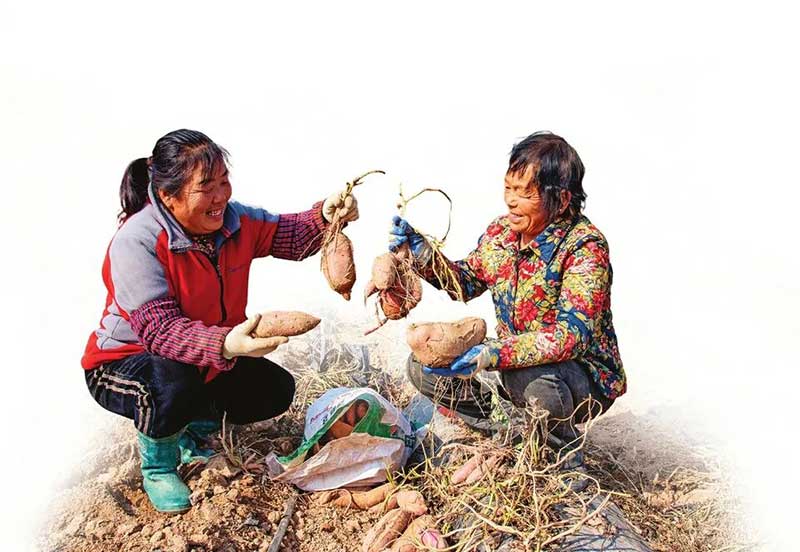 11月5日,在霍州市白龙镇马岭村,百亩红薯喜获丰收,村民正在分装收获的红薯。
