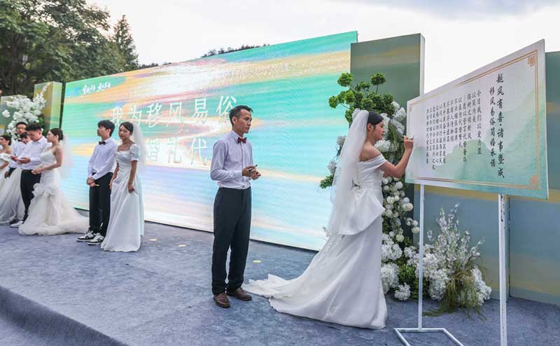 2025年8月20日,在浙江省诸暨市东白湖镇斯宅村举行的集体婚礼上,新人在移风易俗倡议上签名。新华社记者 徐昱 摄