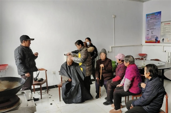 在榆社县北寨乡赵王村的居家养老服务驿站,老人们等待理发。