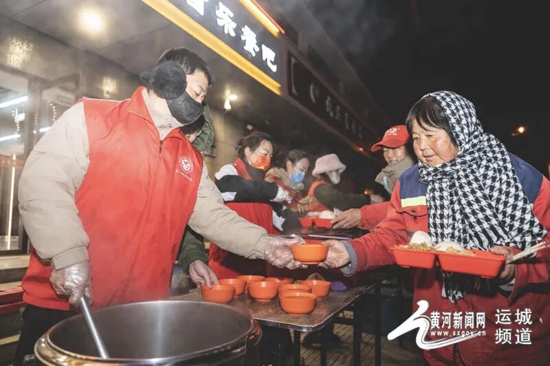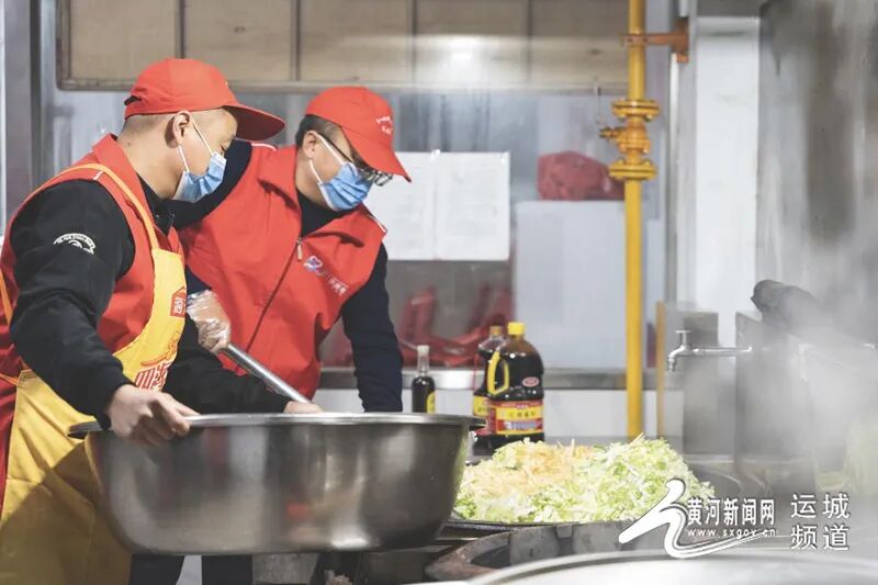 不一会,盐湖区志愿者协会的餐车准时抵达。志愿者们利落地摆开长桌,打饭、递馍、盛菜,动作一气呵成。