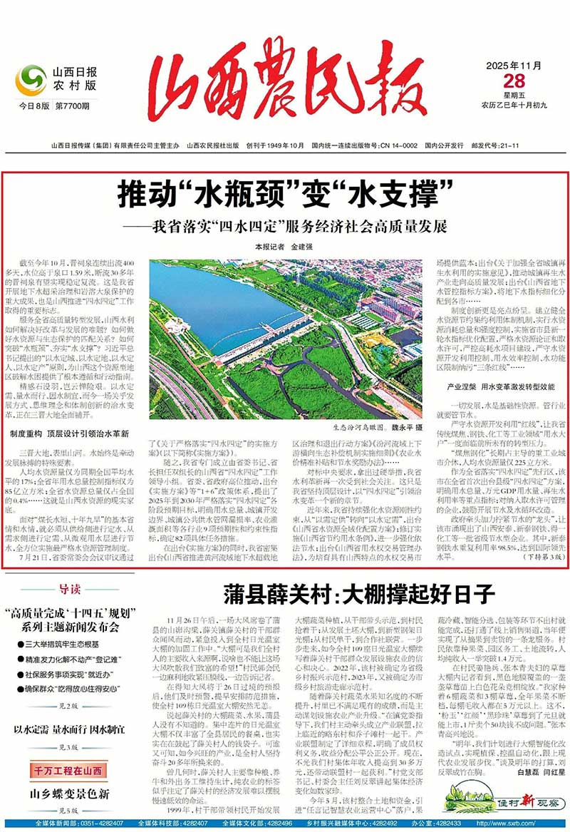 随之,我省专门成立由省委书记、省长担任双组长的山西省“四水四定”工作领导小组。省委、省政府高位推动,出台《实施方案》等“1+6”政策体系,提出了2025年到2030年严格落实“四水四定”各阶段预期目标,明确用水总量、城镇开发边界、城镇公共供水管网漏损率、农业灌溉面积等各行业9项预期性和约束性指标,确定82项具体任务措施。