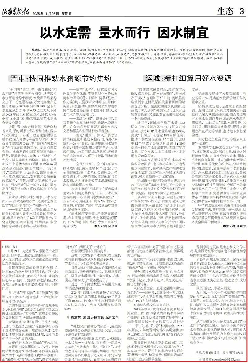 美锦华盛化工新材料公司“熄焦不用水、中水循环用”,通过技术创新和工艺改进,让焦化废水“零排放”,实现水资源的高效循环利用,大幅降低用水量。