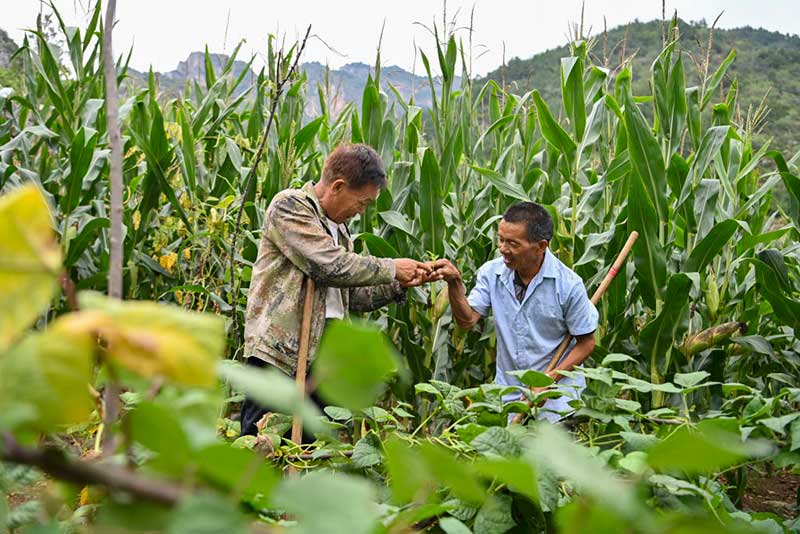 ↑村民桑建平(左)为秦海松夹菜(2025年8月27日摄)。