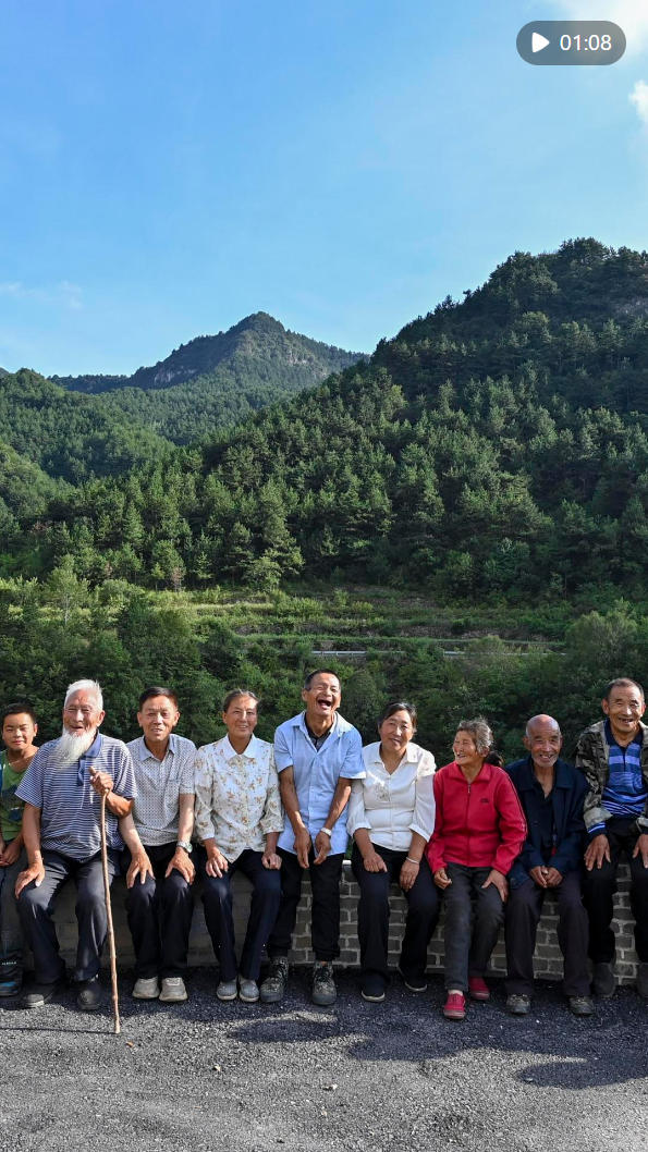↑照顾秦海松的部分村民和秦海松(中)合影(2025年8月27日摄)。