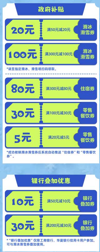 本次冰雪消费券的政府补贴包括滑冰滑雪券、住宿券和零售餐饮券三种,消费者在核销滑冰滑雪券(包含满50元减20元、满300元减100元共2种)之后,云闪付平台自动向其推送住宿券和零售餐饮券,消费者在体验冰雪运动后可到酒店民宿、餐饮小吃、便利购物等场景再次享受政府补贴的优惠。
