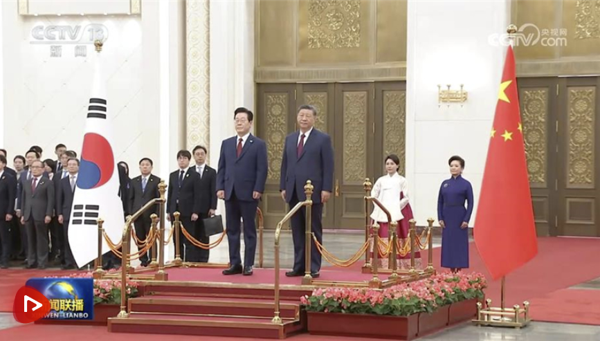 会谈前,习近平和夫人彭丽媛在人民大会堂北大厅为李在明和夫人金惠景举行欢迎仪式。