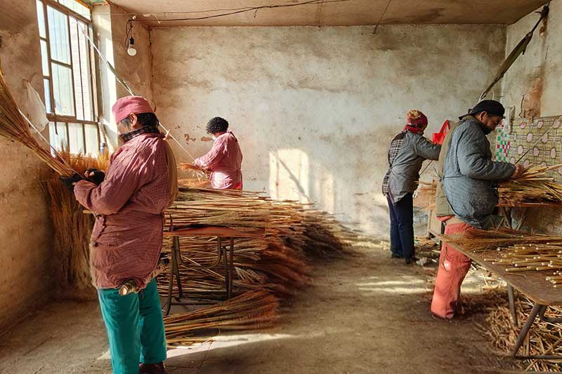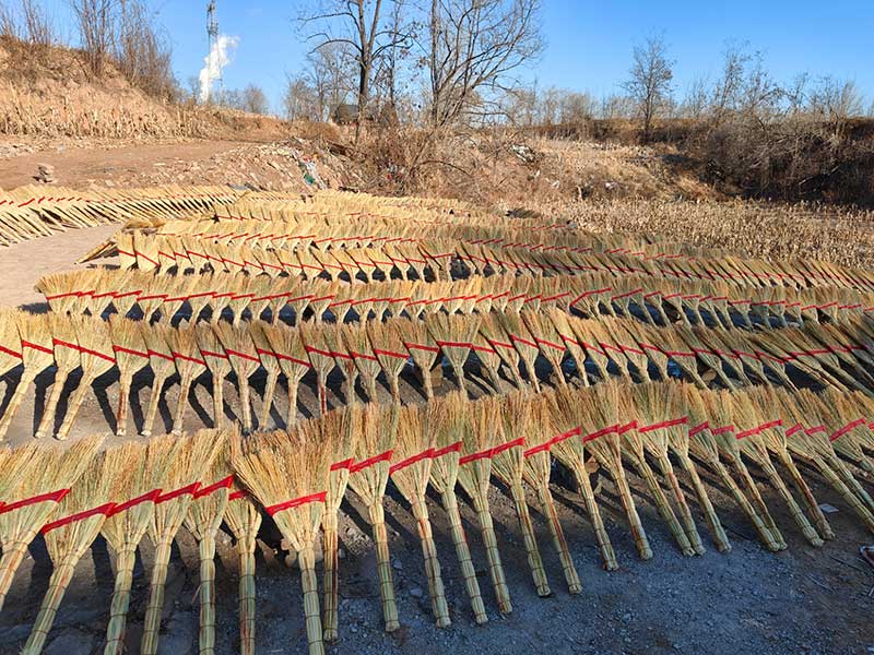 寒冬时节,走进万双虎的手工笤帚工坊,一派忙碌而有序的景象映入眼帘:晒干的高粱秸秆整齐码放,麻绳、剪刀等制作工具分门别类、一应俱全。工人们各司其职,浸泡、分拣、捆扎、定型……一道道工序环环相扣、有条不紊,空气中弥漫着高粱秸秆特有的淡淡草木清香。