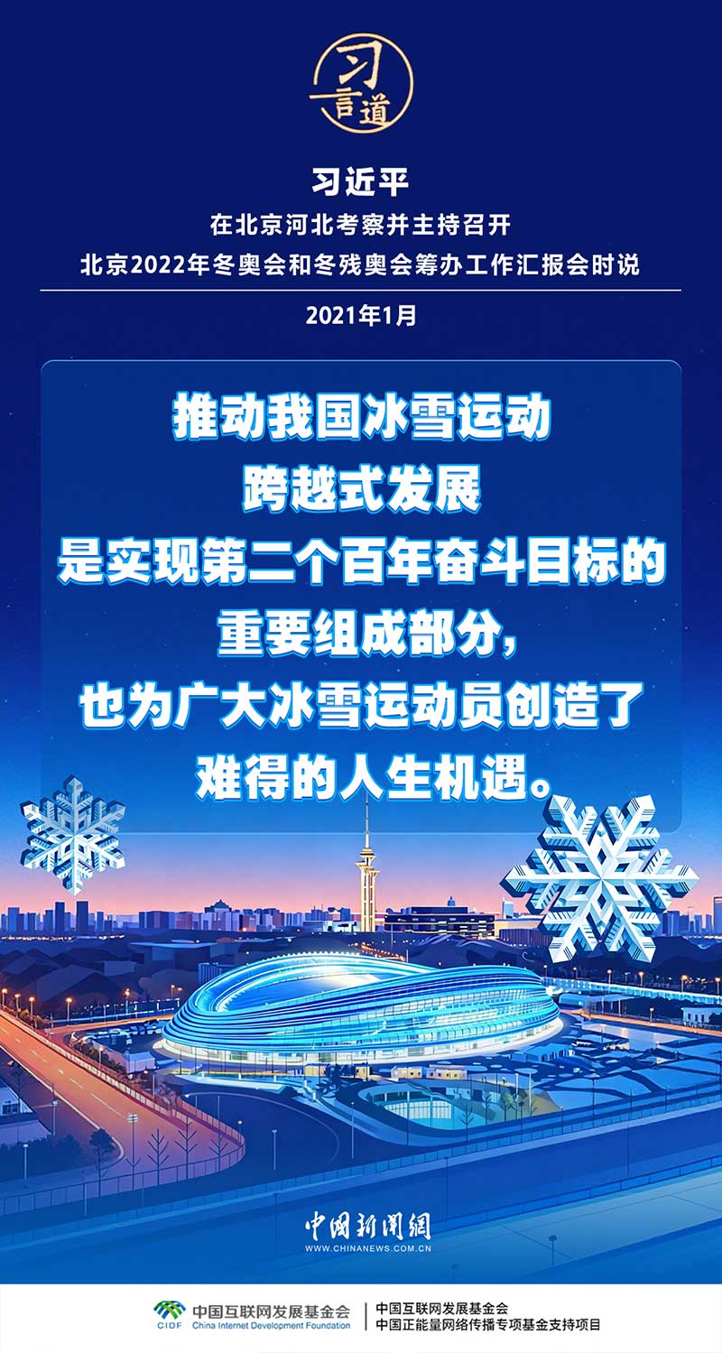 习近平总书记高度重视冰雪运动发展,多次寄语冰雪运动,强调“冰雪运动一定要全面开展”。在他的关心和推动下,冰雪运动跨过山海关,走进全国各地,开启了中国乃至全球冰雪运动新时代。