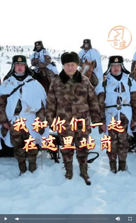 “我和你们一起在这里站岗。”2014年1月26日,习近平主席来到内蒙古阿尔山,冒着零下30多摄氏度的严寒,迎风踏雪慰问在边防线上巡逻执勤的官兵。统帅与士兵心连心,一步一履总关情。士兵,始终是习近平主席心头的牵挂。
