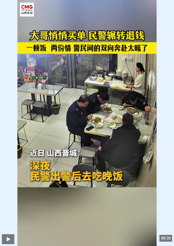 “你们的钱已经付过了!”这句话,温暖了深夜执勤的民警。深夜,山西省晋城市泽州县金村派出所民警辅警执勤结束后,走进一家面馆吃面驱寒。结账时,店主一句“钱已付过”让民警愣住。原来后桌一位大哥悄悄结了账:“你们为平安忙到深夜,四碗面钱只是心意。”