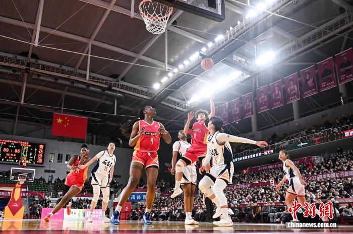 2月1日,山西队球员刘贝(红衣)在比赛中投篮。当日,在太原举行的2025-2026赛季中国女子篮球联赛(WCBA)常规赛第22轮比赛中,山西竹叶青酒队主场以97比94战胜石家庄英励队,以18胜4负的战绩获得常规赛冠军。中新社记者 韦亮 摄