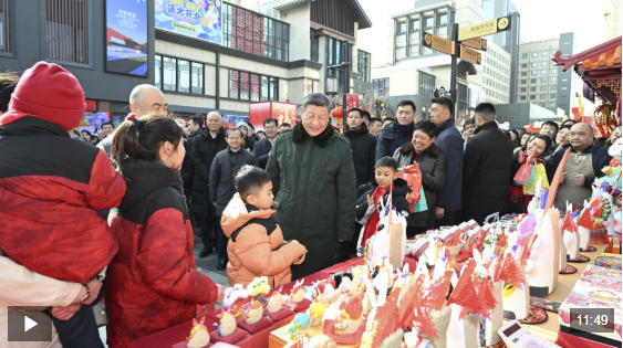 总书记察看街区风貌和各式年货摊位,同现场群众亲切交流。他愉快地向大家讲起年少时多次到隆福寺的情景,还购买了特色食品和文创产品。