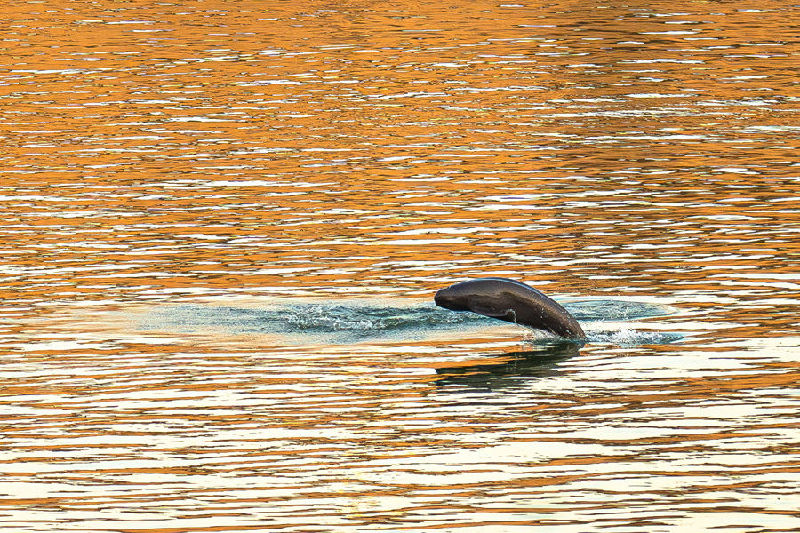 2025年1月5日,长江江豚在长江宜昌葛洲坝下游附近踏浪前行,与浪花共舞。新华社记者 肖艺九 摄