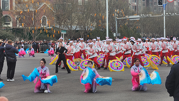 古陶镇南城村的跑竹马非遗表演气势磅礴,将非遗魅力展现得淋漓尽致;机器人舞蹈表演吸睛无数,造型灵动的机器人随鼓点整齐舞动,科技与民俗完美融合,引得观众纷纷拍照,孩子们欢呼雀跃。岳壁乡的《节节高》绝技惊艳全场,3至6岁孩童扮成戏曲人物在成人肩头翩跹起舞,引来阵阵惊叹。襄垣乡的《梨乡献瑞》中,彩扇翩翩如万亩梨花绽放,表演者欢声笑语,满是酥梨丰收的喜悦,诠释了乡村振兴的生动实践。杜家庄乡的干群同心舞,干部群众手拉手、心贴心,展现出凝心聚力、奋勇争先的斗志。城西街道的骏马彩扇队惊艳登场,由百人彩扇舞队、鱼骨扇舞队等联袂组成,将乡村振兴成果与群众幸福融入舞步鼓点。