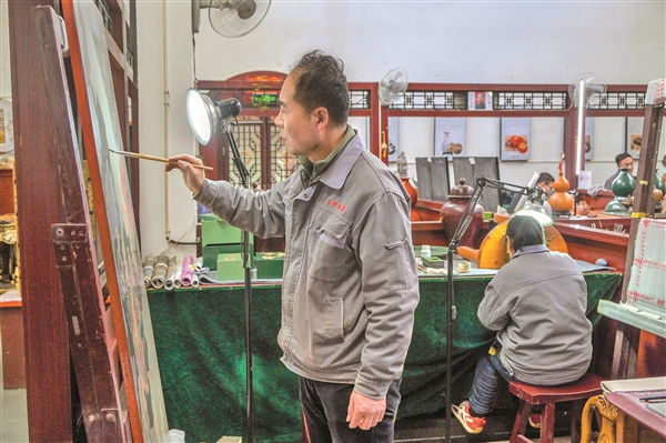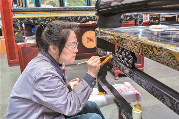 近年来,平遥县唐都推光漆器有限公司依托专业镇建设,坚持研学与创新深度融合,将现代元素融入传统工艺,不断研发兼具实用与艺术价值、适配不同消费群体的新产品,不断拓展新市场,让漆艺非遗技艺焕发新生机。图为3月31日在公司漆艺工作室,漆艺师们精心制作推光漆器订单产品。