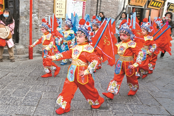 平遥县蓝天幼儿园的小朋友在平遥古城内表演传统戏曲